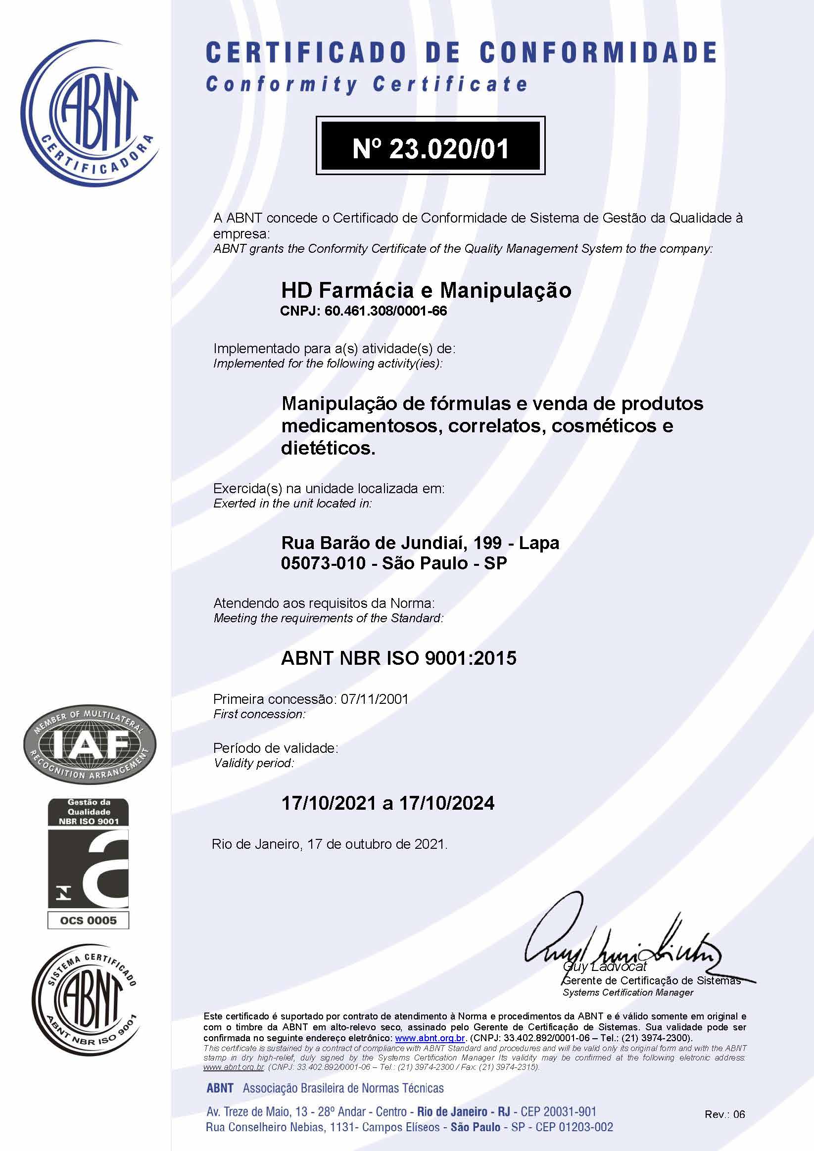 A sua fórmula é assegurada pelo sistema ISO 9001, que estabelece padrões internacionalmente reconhecidos onde todos os processos são validados por uma certificadora habilitada ABNT.